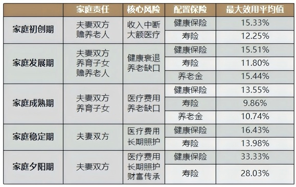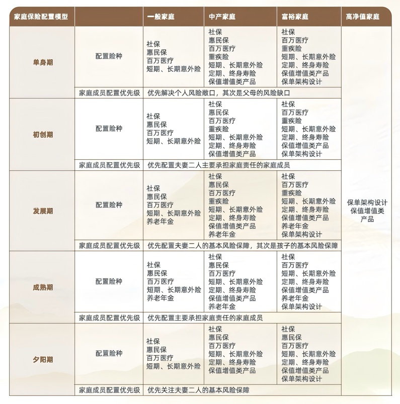 白皮书研究提出动态生命周期下不同财富水平的家庭,其风险特征与保障重点各不相同。比如:初创期一般家庭要优先预防“大病花钱、意外断收入”;发展期中产家庭得扛住“大病、意外+孩子教育、自己养老”双重压力;夕阳期家庭则要重点关注“大病住院、长期照护”的开支。鉴于研究结果,白皮书对不同生命周期、不同财富水平所面临的主要风险,以及需要解决的优先级进行了归类,并对解决这些风险的保险形态进行了梳理,总结出20类典型家庭风险配置模型,任何一个家庭均可根据此模型快速定位自身的风险及应配置的保险形态。