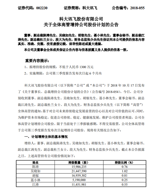 [导读]新浪科技讯10月17日下午消息,科大讯飞发布全体高管增持计划公告,拟在三季报发布次日起6个月内增持不低于1300万元。公告指出,此次增持的资金来源为自筹资金。本次增持不基于增持主体的董事、高级管理人员的特定身份,如丧失相关身份时也将继续实施