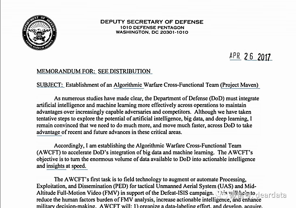 目前,美国空军正在采取行动,将人工智能纳入其运作,美国国防部早已经发现人工智能技术满足军事情报的各项需求。他们的第一个项目就是Project Maven,将使用人工智能和机器学习来快速筛选无人机拍摄的画面,收集有用的情报。早在2017年4月美国国防部常务副部长就签署备忘录推出Project Maven,启动无人机全动态视频人工智能算法项目,以提高无人机视频处理、发掘与分发过程的自主化水平。